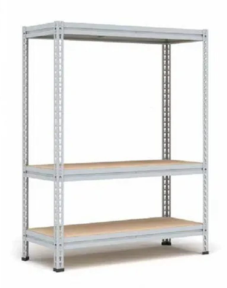 Металлический среднегрузовой стеллаж для склада с настилом из фанеры. Нагрузка на ярус до 300 кг. Быстросборная конструкция (на зацепах).